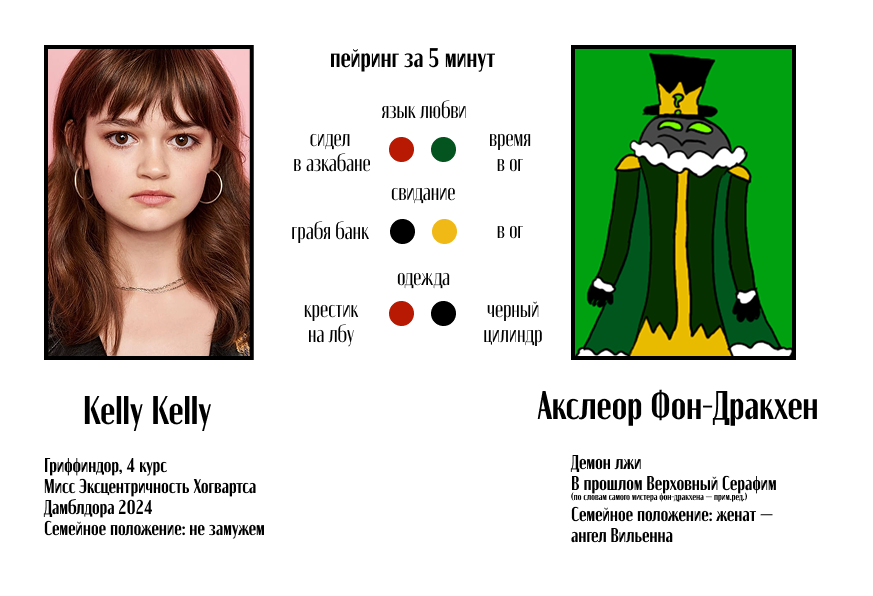 Праздничный эфир в честь Дня святого Валентина чуть было не завершился свадьбой пары, о которой мы до этого никогда не слышали: Келли Келли — четверокурсницы Гриффиндора и соосновательницы «КелЛиты» и Акслеора Фон-Дракхена — ныне демона лжи, а ранее Верховного серафима, изгнанного в ад шесть тысяч лет назад. «Анархист» попытался восстановить подробности их планировавшейся свадьбы, и теперь рассказывает эту историю вам.